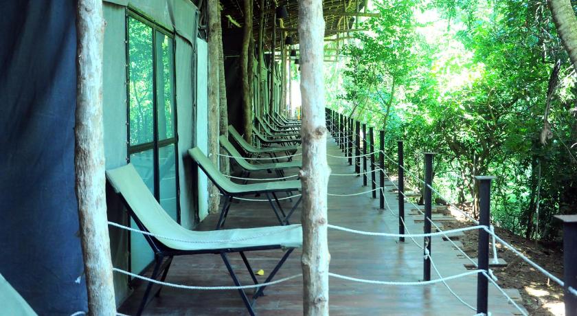 Zimmer: Zelte auf einem Holzdeck, kleiner Terrasse mit Blick in den Dschungel, Dusche/WC, Ventilator.